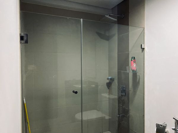 This bathroom features a sleek and modern design with a glass-enclosed shower area, a rain showerhead, and neutral-toned tiles for a clean and contemporary look.