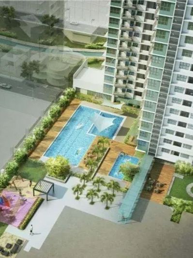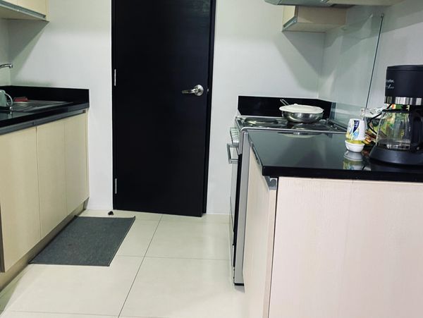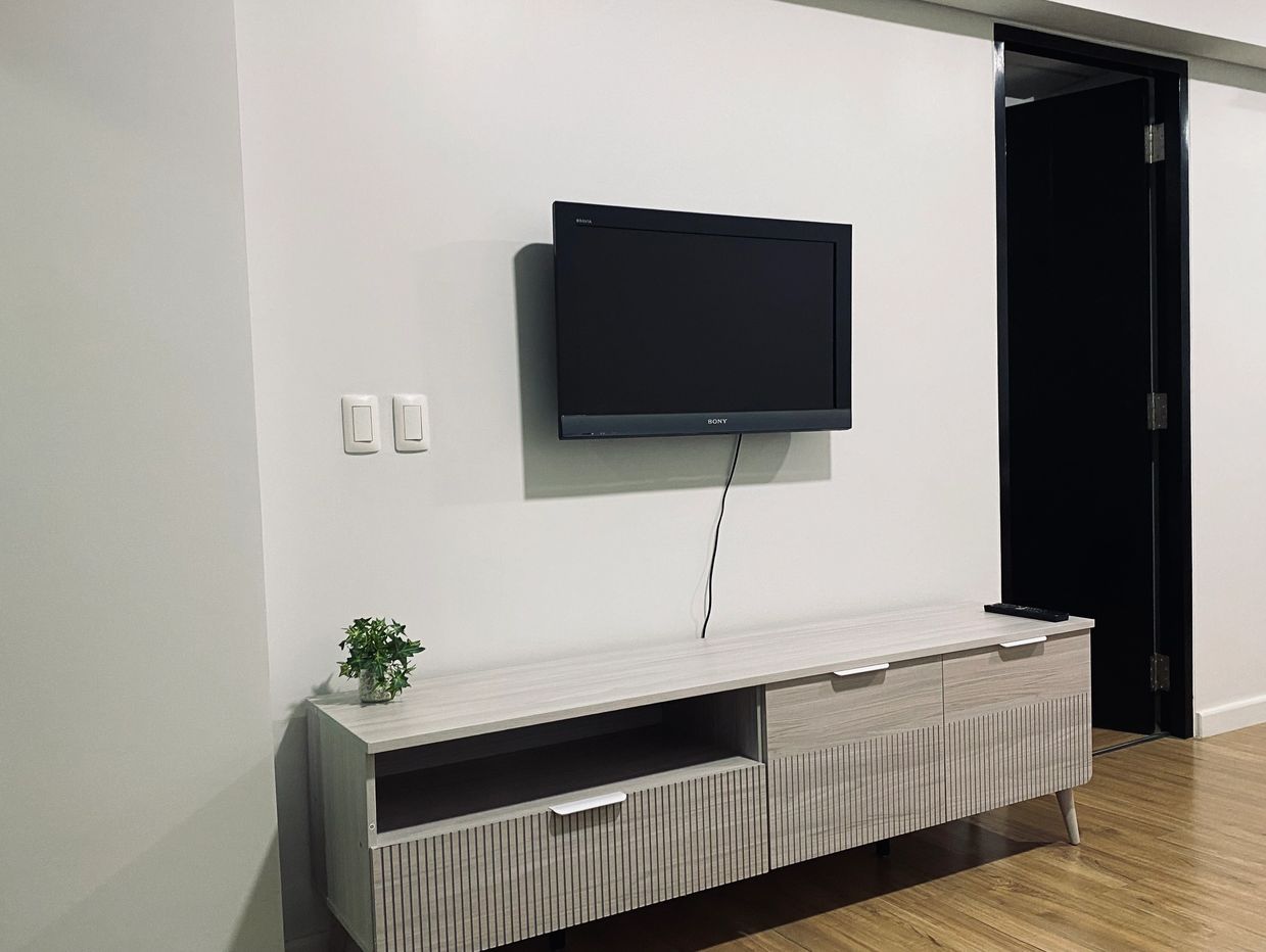Well-maintained 1-bedroom unit in Circuit Makati with a spacious layout, modern wooden flooring, wall-mounted TV, and a functional kitchenette. Ideal for comfortable city living!