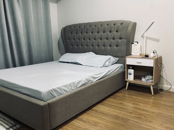 Cozy bedroom with a luxurious tufted bed frame, sleek wooden flooring, and a minimalist bedside table with modern accents. A perfect retreat for relaxation.