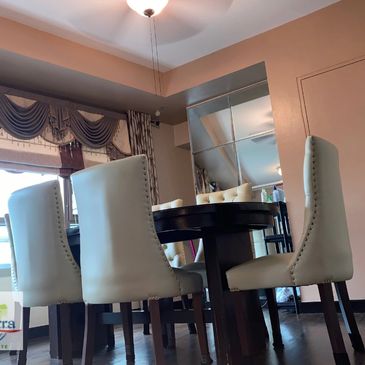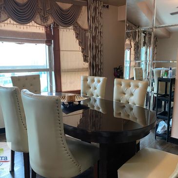 The dining area is adorned with elegant drapes that frame the large windows, adding a touch of classic beauty to the room. The intricate details of the curtains, combined with the natural light streaming through the windows, enhance the overall aesthetic appeal.