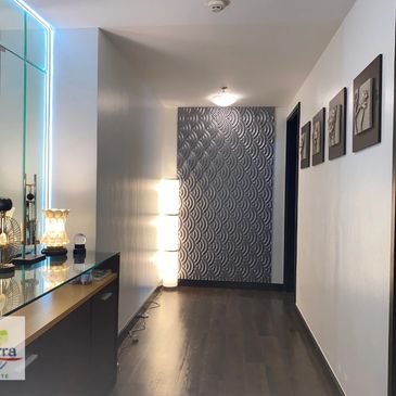 The hallway features a stunning, textured accent wall that adds depth and visual interest to the space. This unique design element creates a focal point and enhances the overall elegance of the hallway.