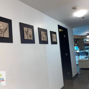 This hallway at The Residences At Greenbelt is a blend of elegance and artistic charm, leading to the luxurious living areas of a 2-bedroom condominium available for lease. Carefully curated design elements make this hallway not just a passage but a statement of style.