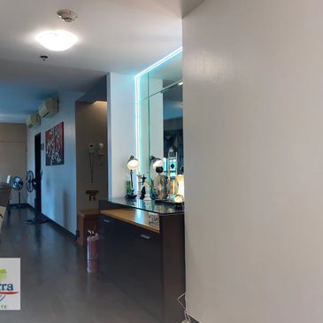Step into an elegantly designed hallway that sets the tone for the luxurious living experience within this 2-bedroom condominium available for lease at The Residences At Greenbelt. This beautifully decorated space combines modern aesthetics with sophisticated details, creating a welcoming and stylish entrance to your home.