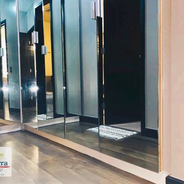 The walk-in closet is designed with full-length mirrored doors that create a sense of spaciousness and elegance. These mirrors not only enhance the visual appeal but also provide practical functionality for dressing and grooming.